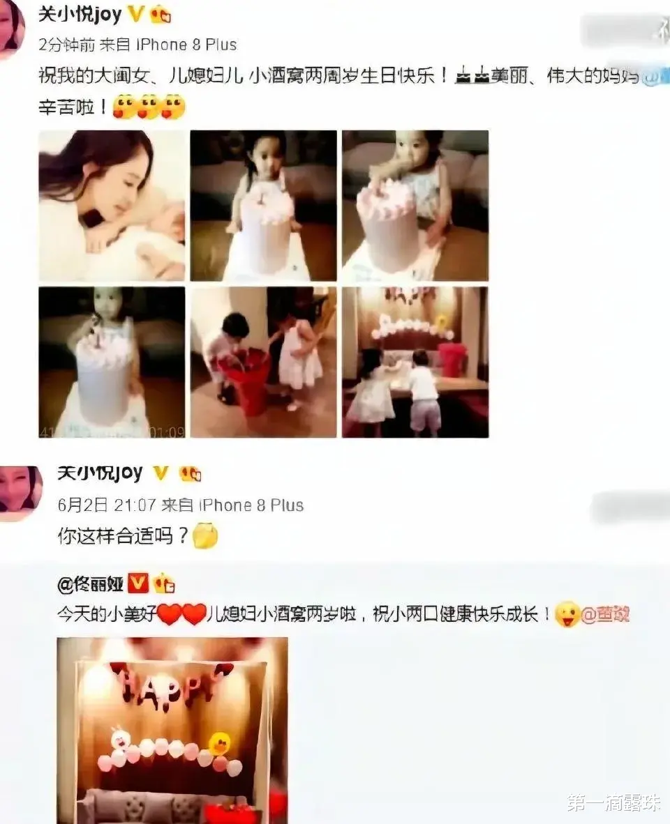 紧接着关悦也发文,祝小酒窝生日快乐,在博文中,关悦也称呼小酒窝为“儿媳妇”。