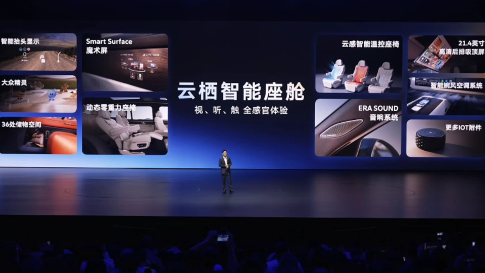 座舱内实现九屏联动,包括前排15.6英寸中控双联屏、后排21.4英寸吸顶屏及3块Smart Surface魔术屏。其中,魔术屏平时隐匿于木纹内饰,需用时自动唤醒,后排门板魔术屏可显示侧后方路况,避免“开门杀”;吸顶屏可跟随二排座椅角度调节,适配不同坐姿观影需求。智能WHUD可自动追踪驾驶者眼球位置并调整投影,适配不同身高人群;“大众精灵”支持语音与手势交互,让出行更便捷有趣;首发ERA SOUND音响系统,带来沉浸式驾乘体验。