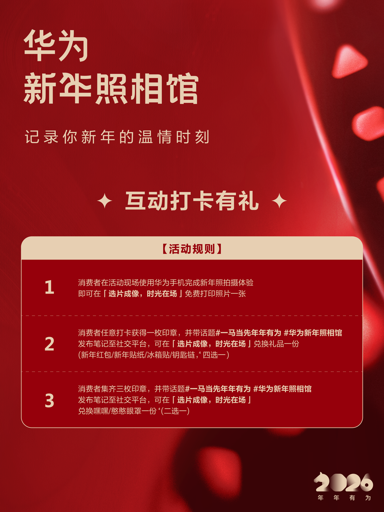 为了让进店体验更具趣味性,华为新年照相馆还设置了打卡环节,用户可以通过“我的华为”APP查看就近的活动场次进行报名;到馆后完成打卡任务即可获得精美奖品,参与过程轻松有趣。