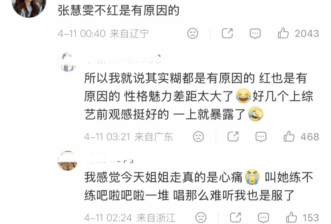 张慧雯唱功拉胯,一公舞台上跑调严重,声音还盖过队友,拖了整个团队的后腿。