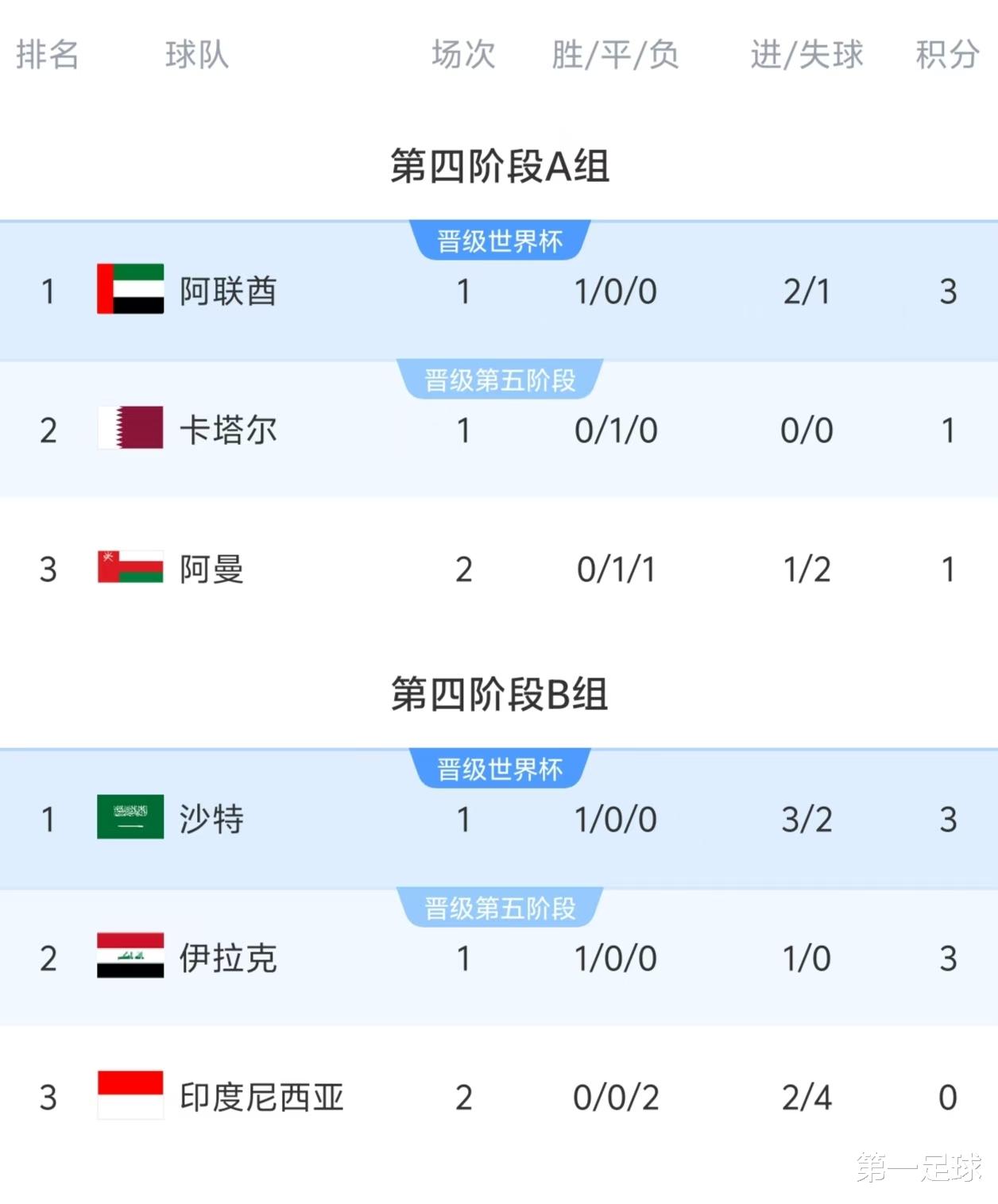 A组最新排名,阿联酋队积3分排名第一,卡塔尔队积1分排名第二,阿曼队积1分垫底。卡塔尔队虽然连续两次夺得亚洲杯冠军,但在世预赛成绩从来都不好,2018年世界杯预选赛和中国队一组,就小组垫底出局,这届18强赛,表现其实也很糟糕,总丢球数24个,位居各队之首,也是亏得小组有吉尔吉斯斯坦和朝鲜,最终排名第四,拿到了附加赛资格。