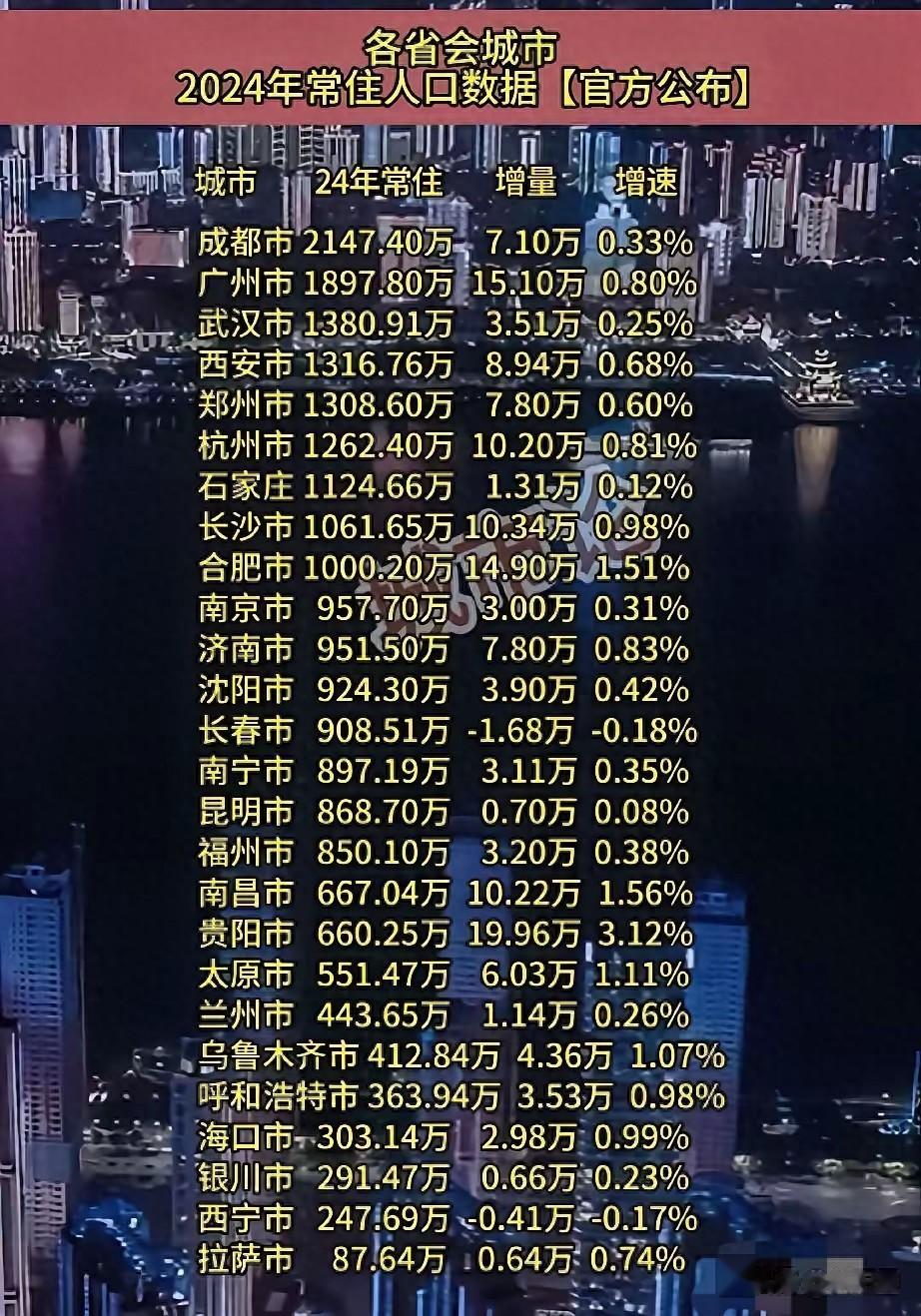 接着我们看经济数据,在过去的2024年,成都的GDP怎么样位居我国省会城市第二名。这个数据仅仅比第一名的超一线城市广州少,高过武汉、杭州、南京中东部排名前列的一线城市,更是远远高于长沙、郑州这些新一线城市。