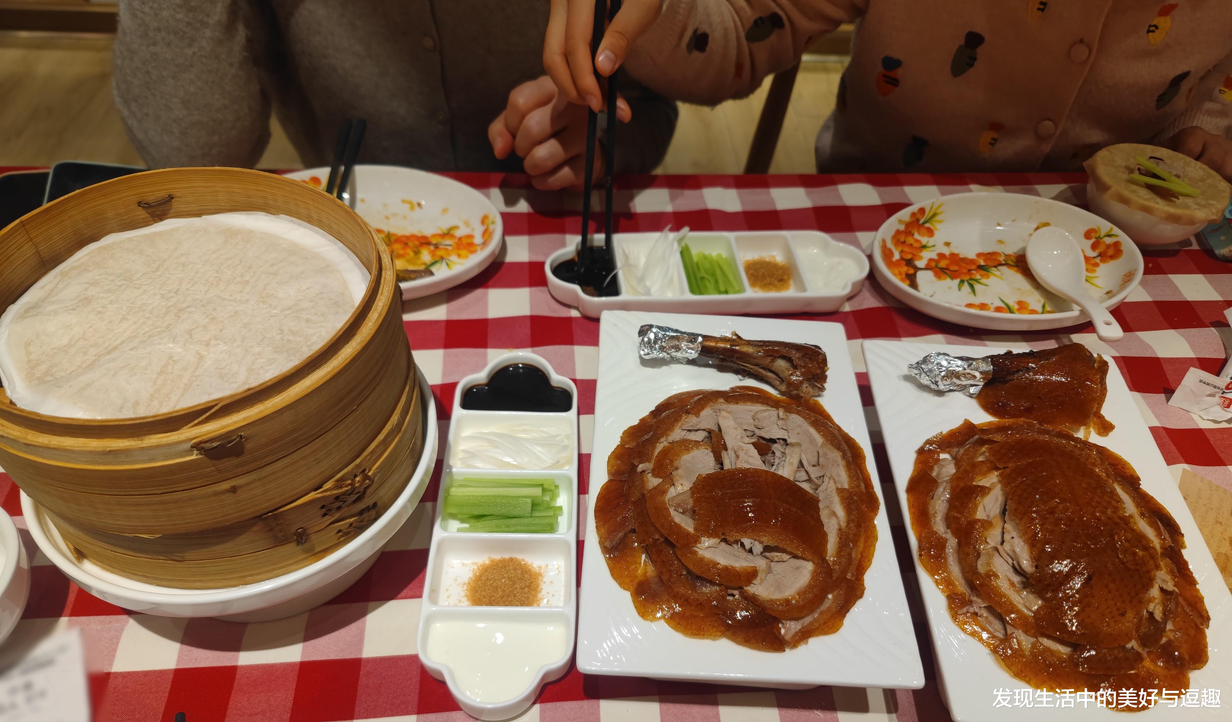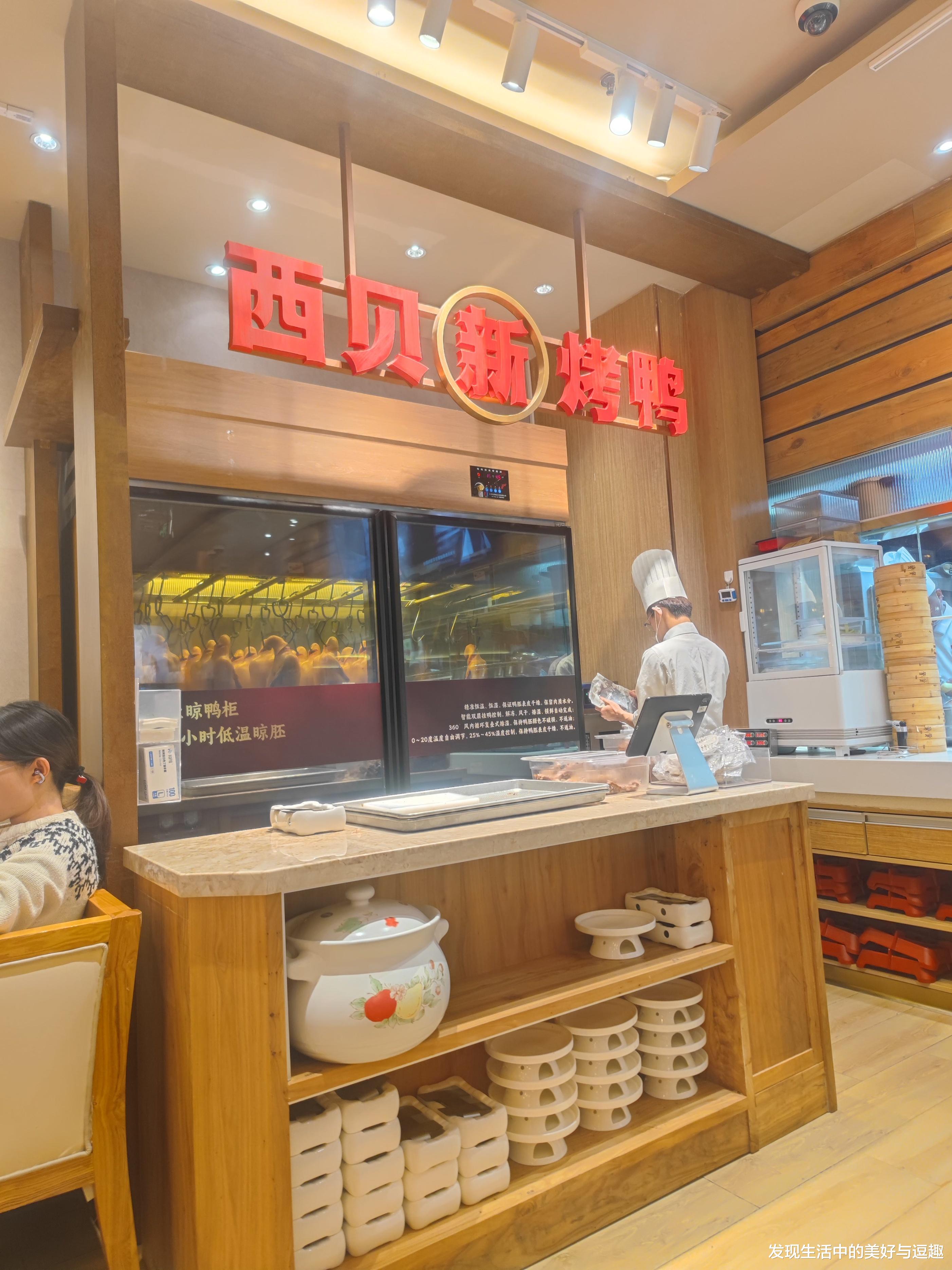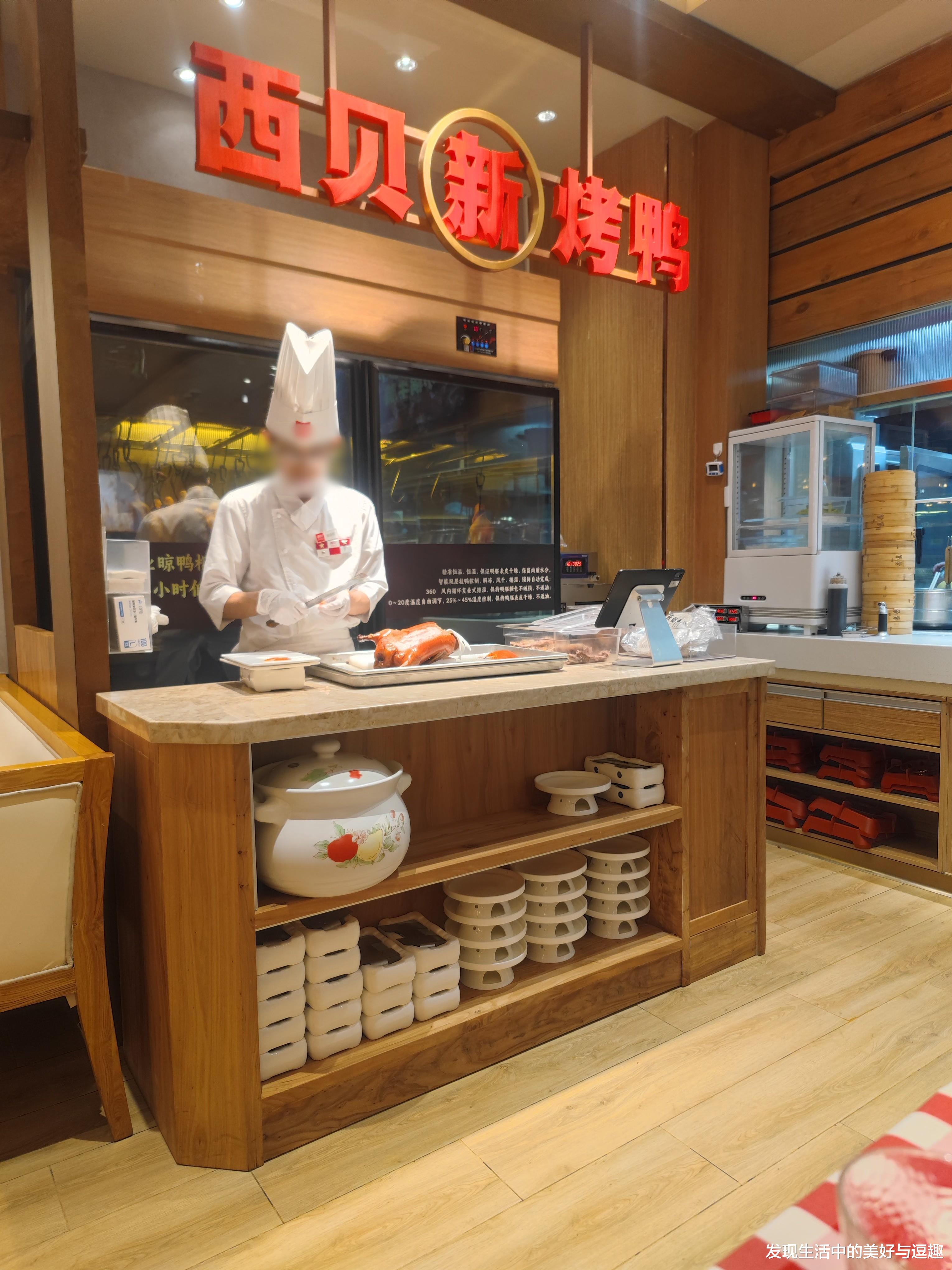 现场在我们桌旁边看到了一个新招牌“西贝新烤鸭”?!现场烤、片