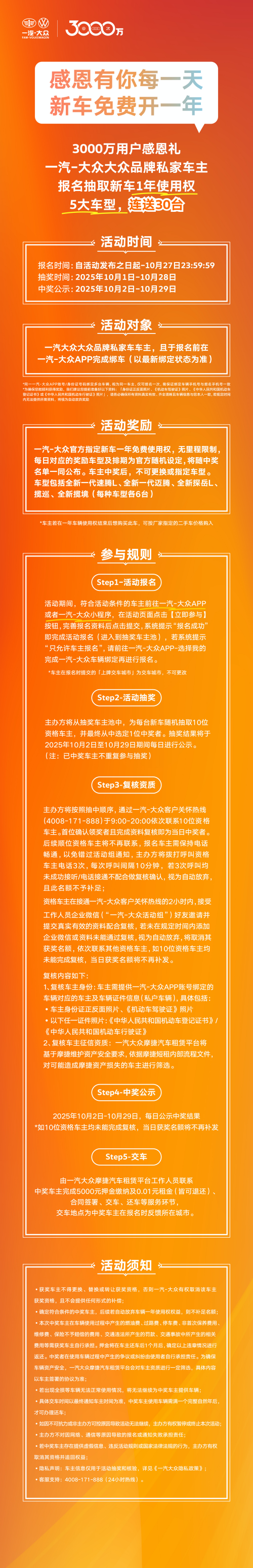 3000万车主是一汽-大众最宝贵的财富,也是未来竞争的基石。为进一步提升客户体验,一汽-大众大众品牌秉持“以客户为中心的长期主义和利他主义”,创新打造了客户品牌“大众老友记”,围绕老友“升值、服务、欢聚、关爱、陪伴”五大维度,提供一系列权益,推动客户成为品牌建设的参与者和受益者。面对新朋友,大众品牌也持续提供多重具有竞争力的权益与服务,让新老朋友均能享受到高价值的用车生活。
