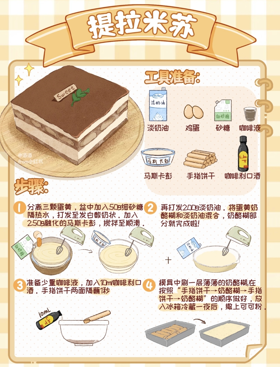 其实这道“家常提拉米苏”,妙就妙在“不用较真”:没有马斯卡彭就用酸奶,没有手指饼干就用消化饼,甚至连打蛋器都能用筷子代替——美食本来就是让人开心的,不用跟着食谱“精确到克”,按自己的口味调,甜一点、苦一点,都是属于你的“带我走”。