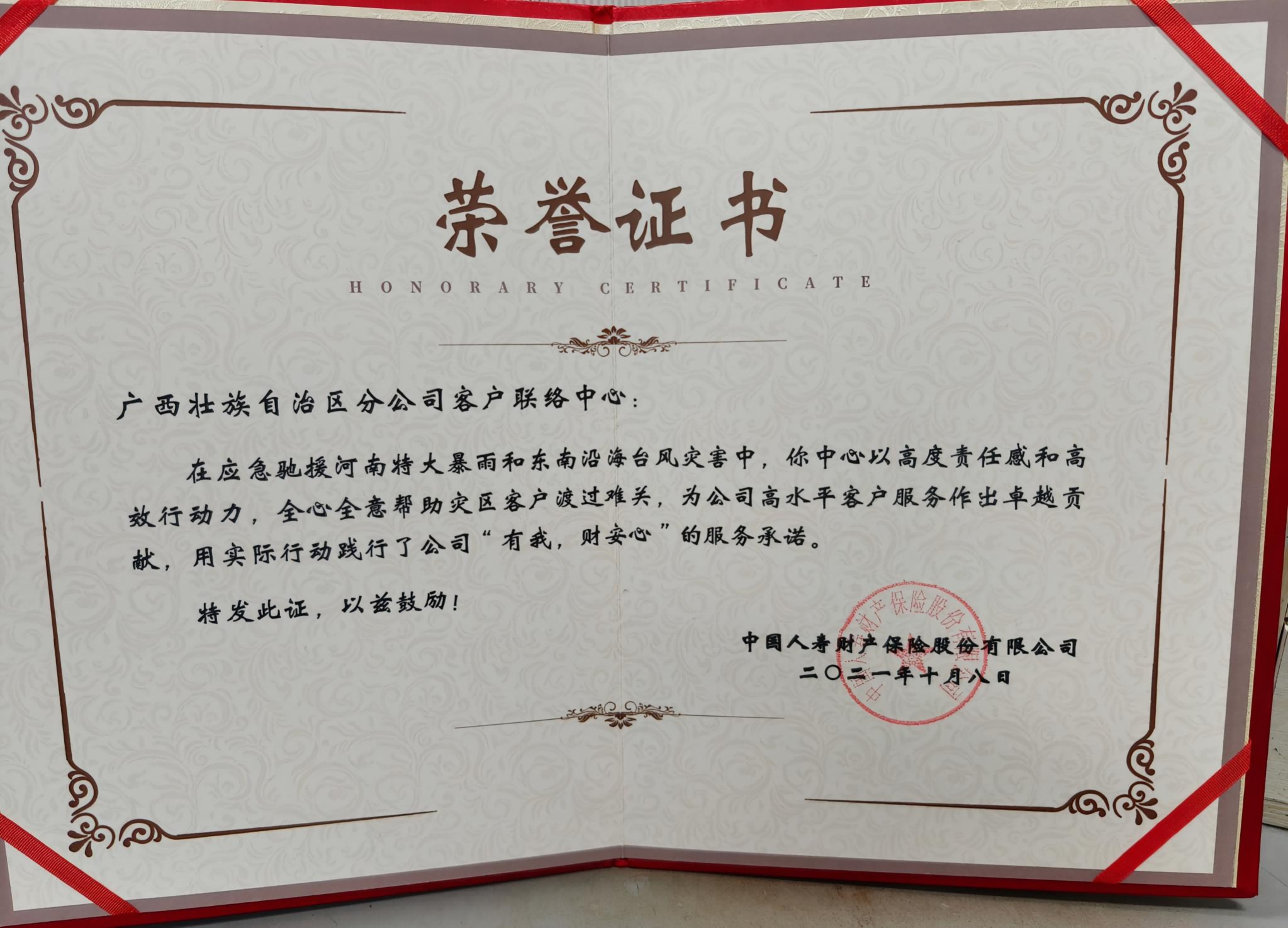 2021年7月,河南省发生了特大暴雨导致严重洪涝灾害,人民群众遭受重大财产损失。面对灾区电话服务告急,广西客户联络中心主动请缨、全员上线、客场作战,通过电波千里驰援灾区一线,筑牢受灾客户内心深处的安全防线。7月23日,一位女士到郑州公司询问客服人员的名字,表扬了客服人员在她最无助的时候给予了耐心指导、及时疏导不安情绪、快速转办需求并得到解决,让客户感受到了安心。支援期间,广西客户联络中心仅有16人的团队,以高度的责任感和高效的执行力接通了灾区10034通电话。年复一年,同样的话术、不同的场景,在职场里此起彼伏的回响,我们同心共济,只为用充满力量的声音与话语去安抚焦虑的心。