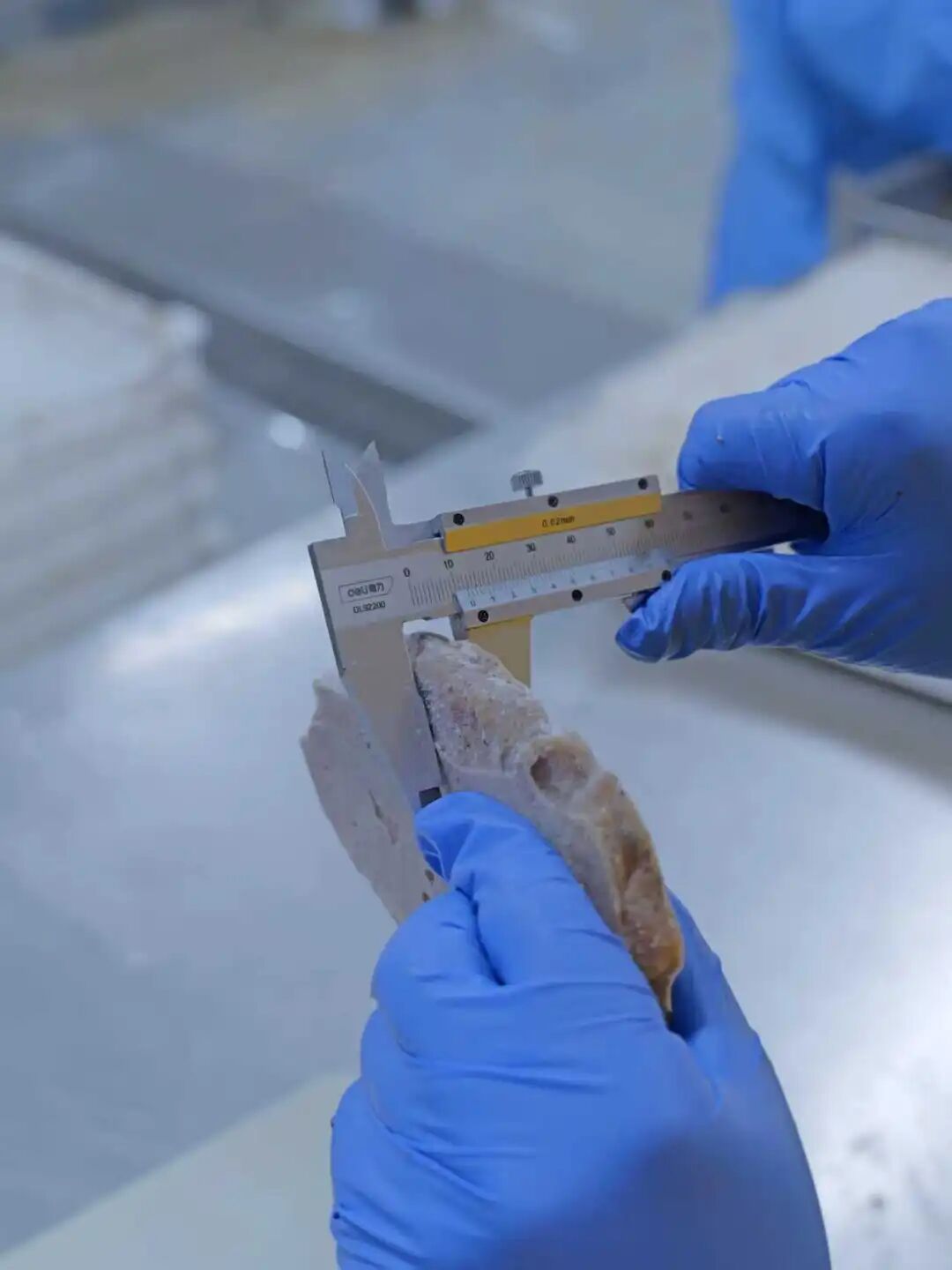 针对厚薄不均的难题,公司创新性地将常用于其他肉制品加工的压整机,应用于猪排生产。“这并非行业通用做法,但我们通过工艺调试,成功实现了猪排厚度的标准化压制,确保了每一片猪排厚薄均匀。”王宗志介绍。这一步,解决了出品稳定性的核心障碍。