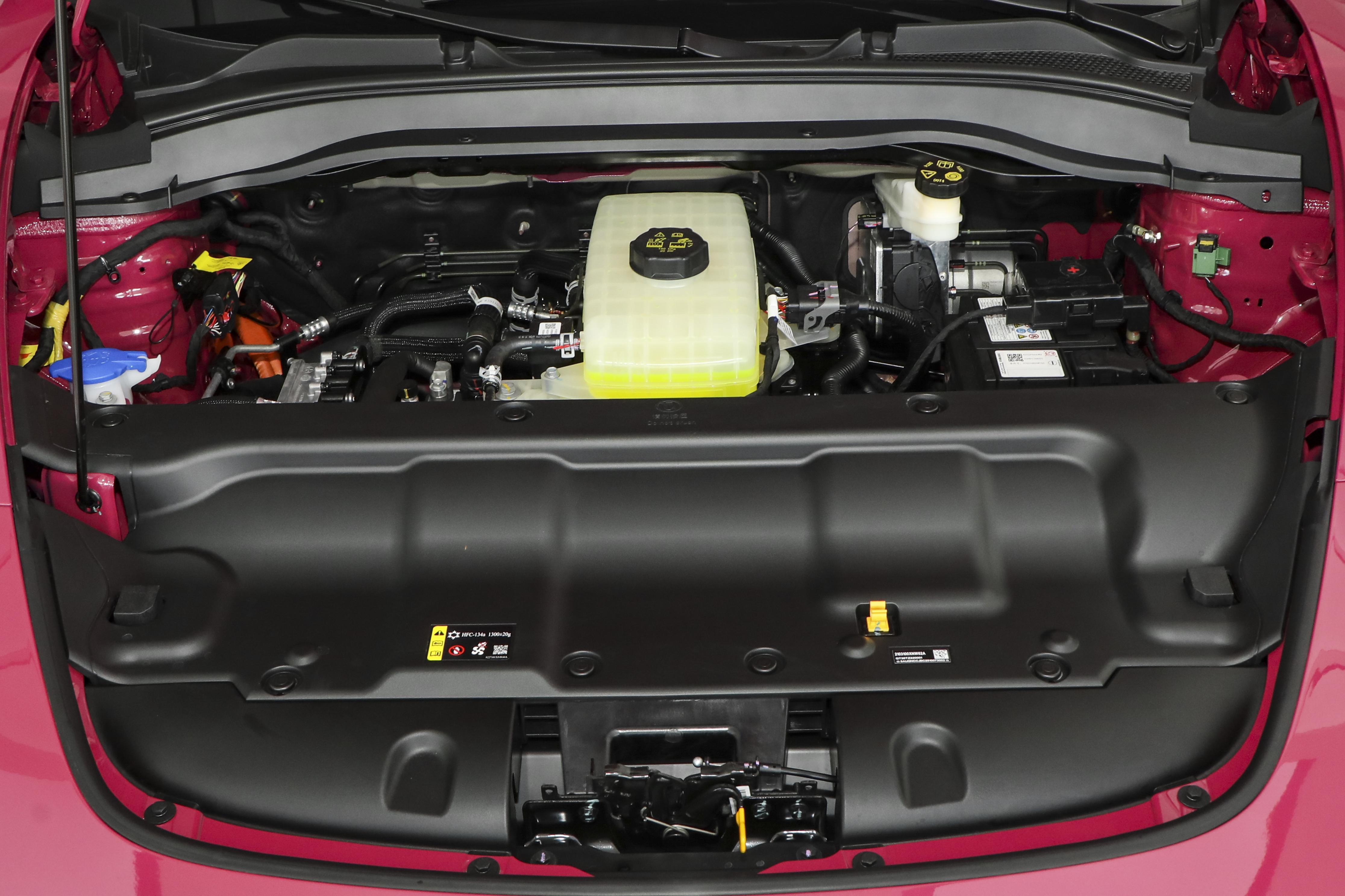 前大灯圆形头灯像猫咪的眼睛,灵动又可爱,设计捕捉“水滴悬于叶尖、将坠未坠的那一刹那”,内部采用LED灯珠与D60高性能透镜,远光照射距离可达170米;车头盖上有两条隆起的筋线,给可爱的样子添了一点肌肉感。