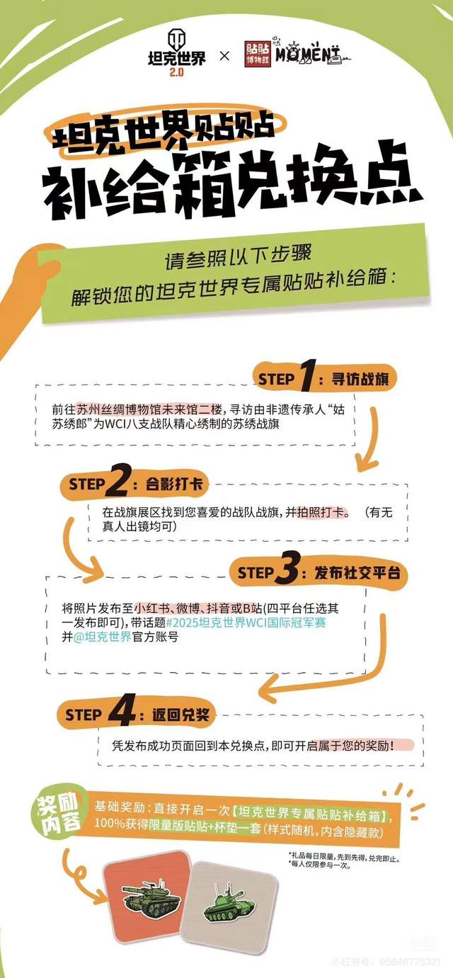 对于亲临过WCI现场的车长,除了参加上述“车长非遗文化打卡活动”外,还可以直接到博物馆,凭贴贴兑换卡,直接获得坦克世界限量版贴贴+定制杯垫(款式随机)一套,无需额外操作,专属福利直接拿到手!