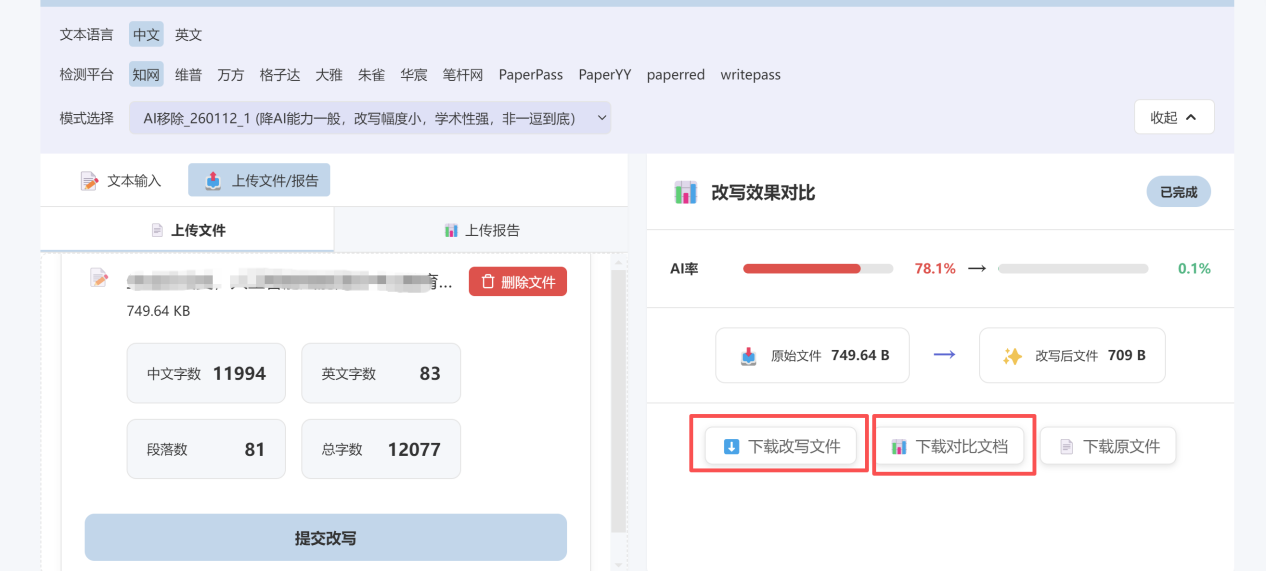 二、核心功能实测:降AI+降重双在线,数据真实可查