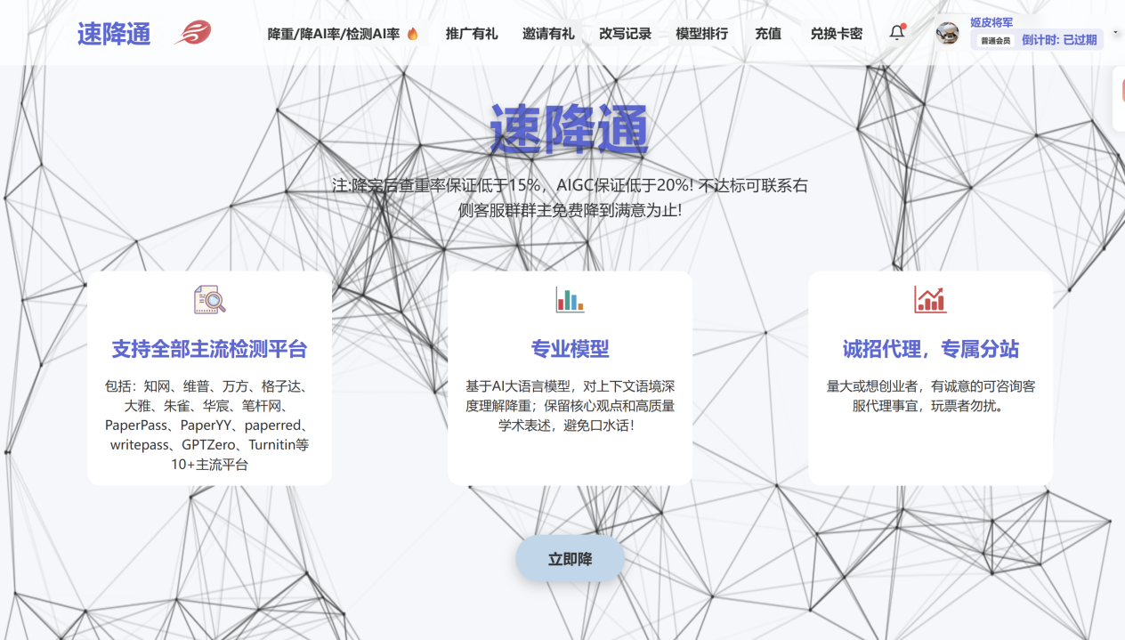 首先说下速降通官网的使用感受,作为一个不怎么懂复杂工具操作的人,我第一次打开官网就觉得很省心。官网没有花里胡哨的广告,首页就清晰标注了核心功能——论文降AIGC率+降重,还有明确的服务承诺,比如“AI率低于20%、查重率低于15%,未达标可退款”,一眼就能get到重点,比那些藏着掖着功能的平台实在多了。
