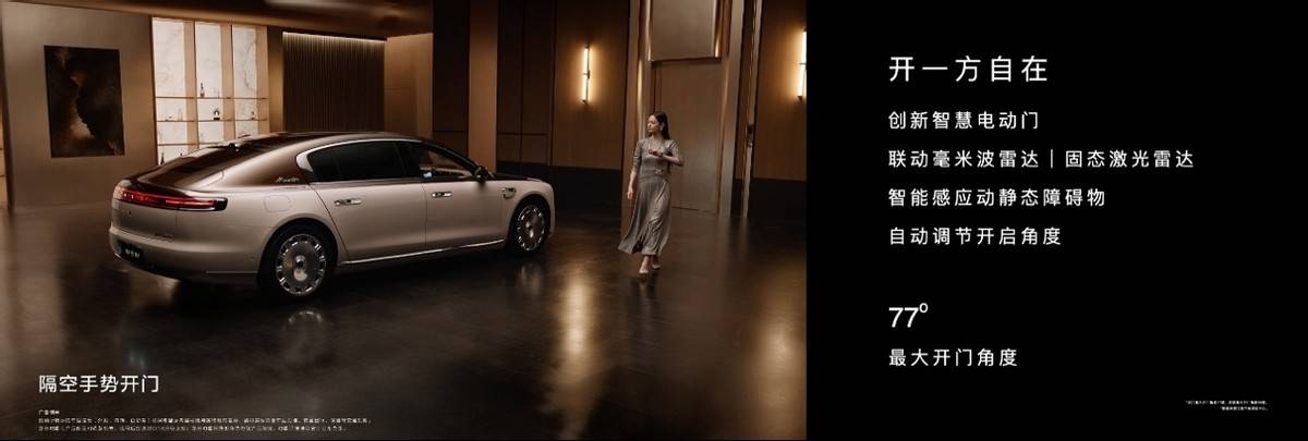 开一方自在,启一程尊贵。尊界S800的创新智慧电动门,联动毫米波雷达与固态激光雷达,智能感应动静态障碍物,自动调节开启角度,最大开门角度达77°,支持隔空手势开关车门。引入NearLink华为星闪连接技术,定位精度较蓝牙钥匙方案提升5倍,解闭锁精准度提升6倍。星徽流转智能迎宾光毯与星光大道侧翼光毯点亮,带来满满的科技感与仪式感。