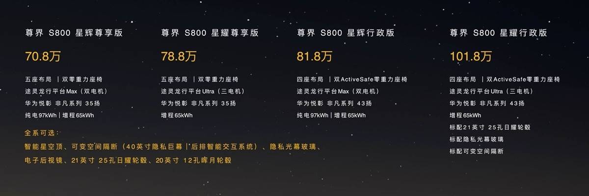 尊界S800官方建议零售价:尊界S800星辉尊享版70.8万元起,尊界S800星耀尊享版78.8万元起;尊界S800星辉行政版81.8万元起;尊界S800星耀行政版101.8万元起。尊界S800先行者计划6月26日开始交付,限量599台。8月中旬开始规模批量交付。