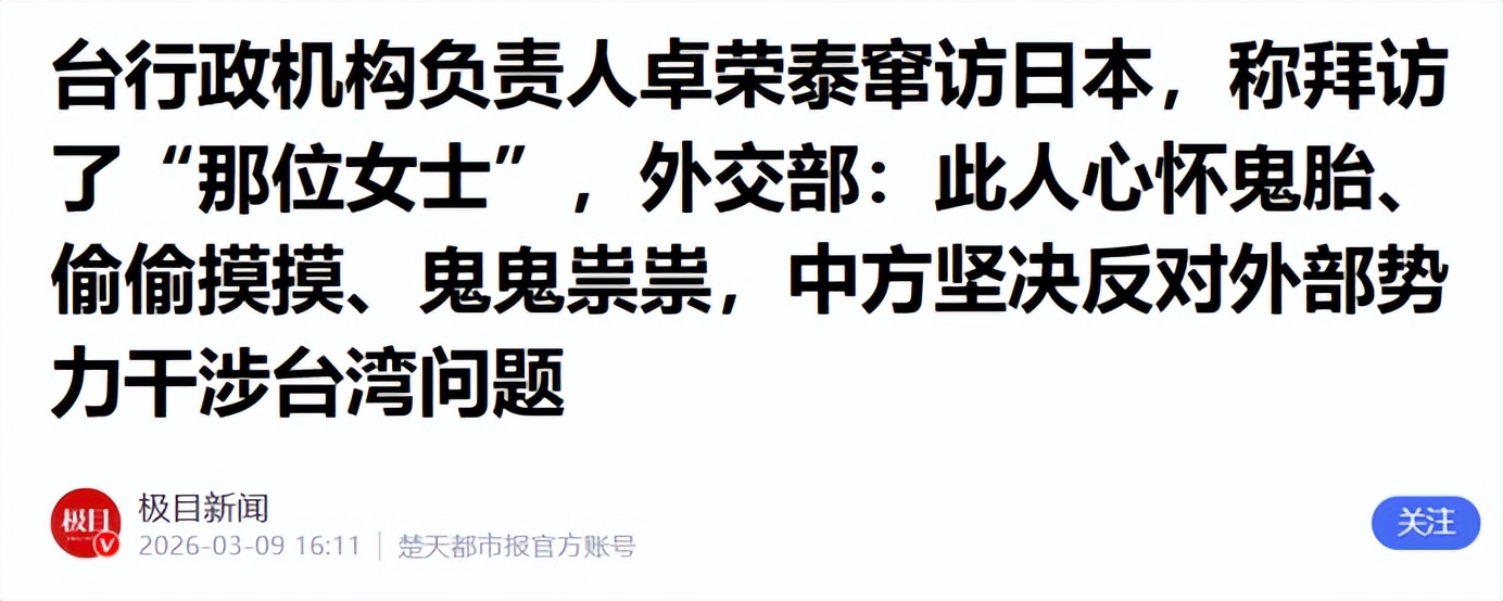 要知道自 1972 年台日断交后,54 年来从未有台湾地区现任行政机构负责人公然踏足日本,如此高位阶官员的出行,怎么可能是简单的私人观赛,后续更是有消息曝出,卓荣泰此行并非只看球,还见到了日本的 “那位女士”,所谓私人行程的遮羞布,被彻底撕了个干净。