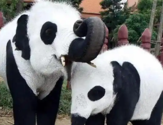 一些人找来黑白颜料,在大象、狗、鳄鱼等本土动物身上涂抹,试图打造出“山寨版大熊猫”,远远望去,这些被染色的动物确实有几分相似…