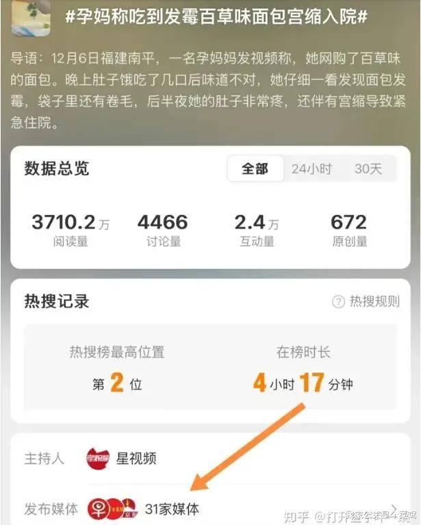 话题#孕妈称吃到发霉百草味面包宫缩入院#,热搜最高冲到第二位,主持人是星视频,发布媒体共31家,阅读量近4000万(数据来自某知乎网友的截图);