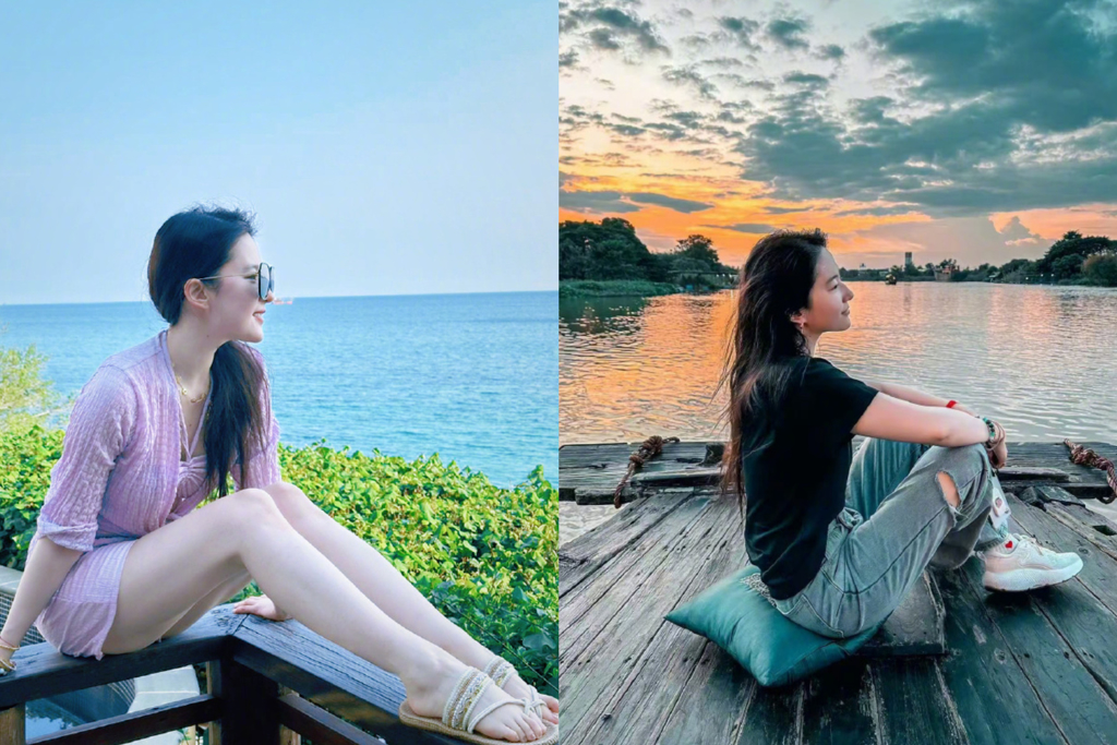 此外,还包括她身穿浅粉色挂脖上衣,戴着太阳眼镜,脚踩编织草鞋露出一双美腿,坐在栏杆上欣赏风景,以及她一身简约黑T恤搭配牛仔裤,静静欣赏日落的美照,素颜模样清纯可人,不用任何化妆品修饰,肌肤状态看上去依旧水嫩紧致。