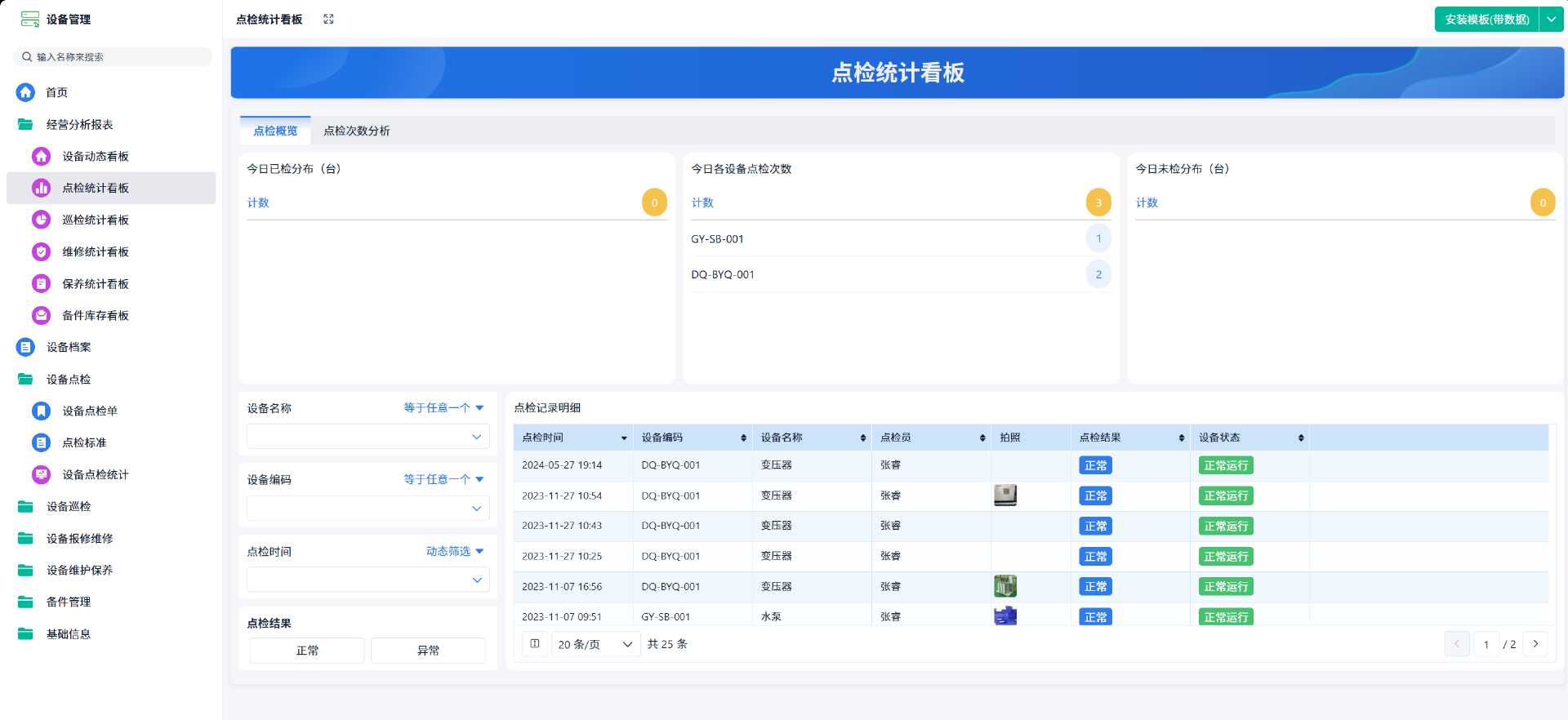 点检看板里,变压器连续六次点检结果都是正常,和记录的设备状态是一致的。但假设这里的设备状态是“显示关闭”的,那正常吗?用过来人的经验告诉你,这里有个坑:点检项目设置可能不合理。如果每次点检都是正常,但设备实际运行时老出小毛病,那就要重新评估点检标准了。是不是关键部位没检到?还是点检方法不对?