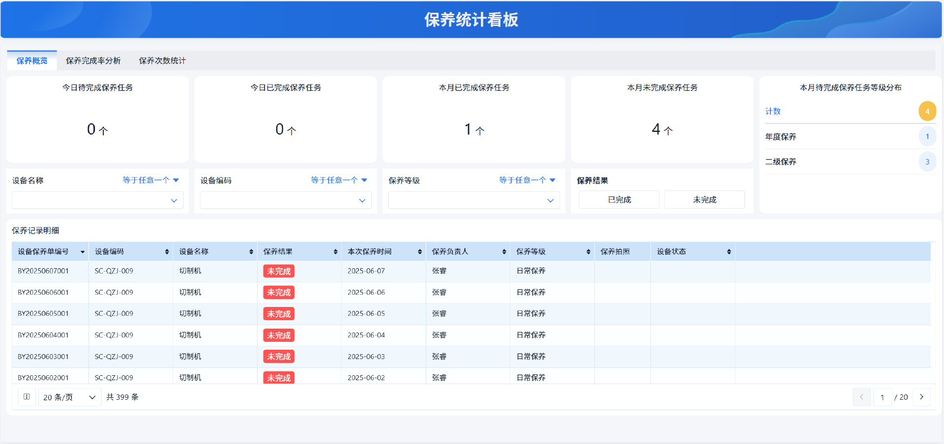 这张保养看板里有个扎眼的数据:同一台切换机连续六天日保养未完成。说实话,日保养连续这么久没完成,这已经不是设备问题,是管理问题了。是负责人忘了?还是设备一直在生产没机会保养?或者是保养流程太复杂?