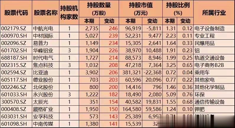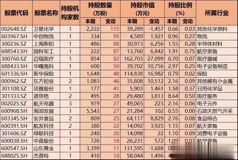 有意思的是,翻翻这些公司的赛道,商业航天里的中航高科、航天彩虹,半导体里的上海新阳、华曙高科,医药里的迈瑞医疗——迈瑞医疗虽然加得不多,可手里握着十六个多亿——全都稳稳当当待在名单里。