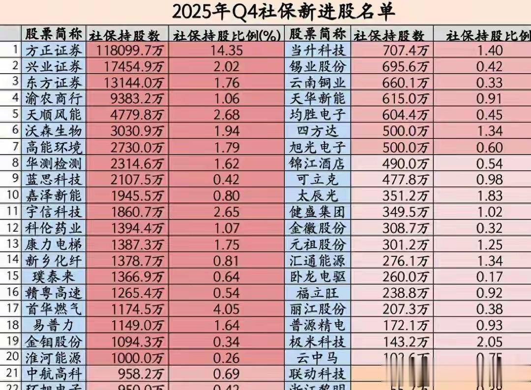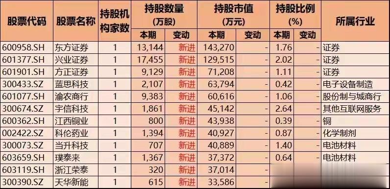 先看新面孔,这46家里面,金融这块儿挺扎眼。东方证券、兴业证券、方正证券,三家券商都被社保基金新买进去了,光兴业证券一家就砸进去接近十三个亿的市值,持股比例都过了一个点,这显然不是随便试试水温。