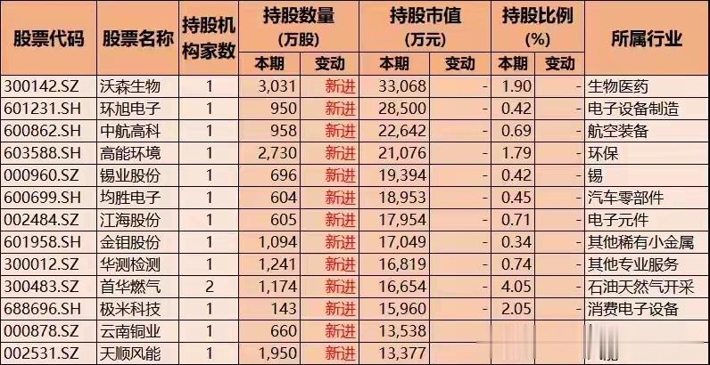 渝农商行也新进了,六亿多的市值搁那儿摆着。除了金融,新能源电池材料那边也没落下,当升科技、璞泰来、天华新能都在名单上,当升科技买了四个多亿。医药里头沃森生物、科伦药业也被挑中,一个三个多亿,持股比例接近百分之二。