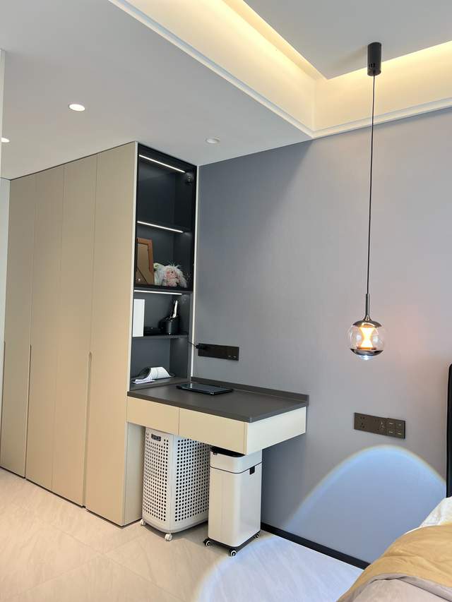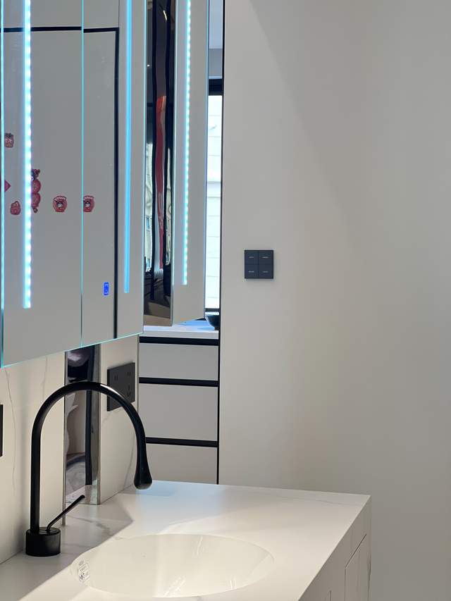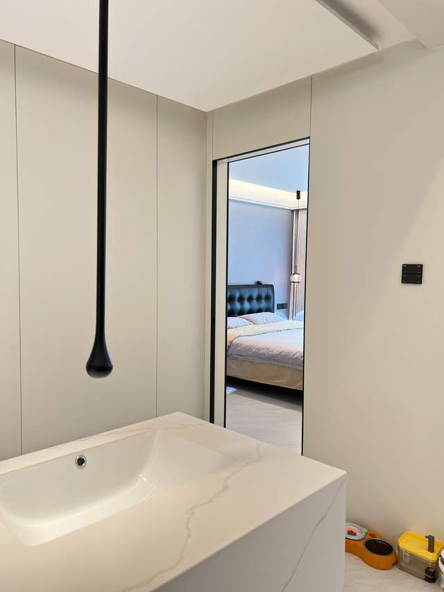 黑色金属材质的吊灯与水龙头,成为空间中低调的色彩点缀,与浅色系的背景形成鲜明对比,瞬间提升了空间的时尚质感。镜面设计的运用则巧妙拓展了视觉空间,让原本不大的区域显得更为开阔通透。细节处,隐形门的设计让空间的整体性更强,没有多余的装饰堆砌,每一处线条都简洁利落,尽显极简设计的精髓。