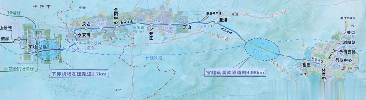 长浏快线即长沙至浏阳线黄花机场至浏阳段工程线路,这条线路是专门为浏阳而修建的一条城际线,它是以城际的名义为浏阳修建的一条地铁,全长约48.6公里,起于黄花机场T3航站楼,主要途经金城大道、浏永公路、花炮大道和浏阳大道,最后止于浏阳关口站,它可以串联长沙南站和黄花机场,全线设站21座,相当于4公里一个车站,这个车站设置还是很合理,可以照顾大部分的人乘车需求。