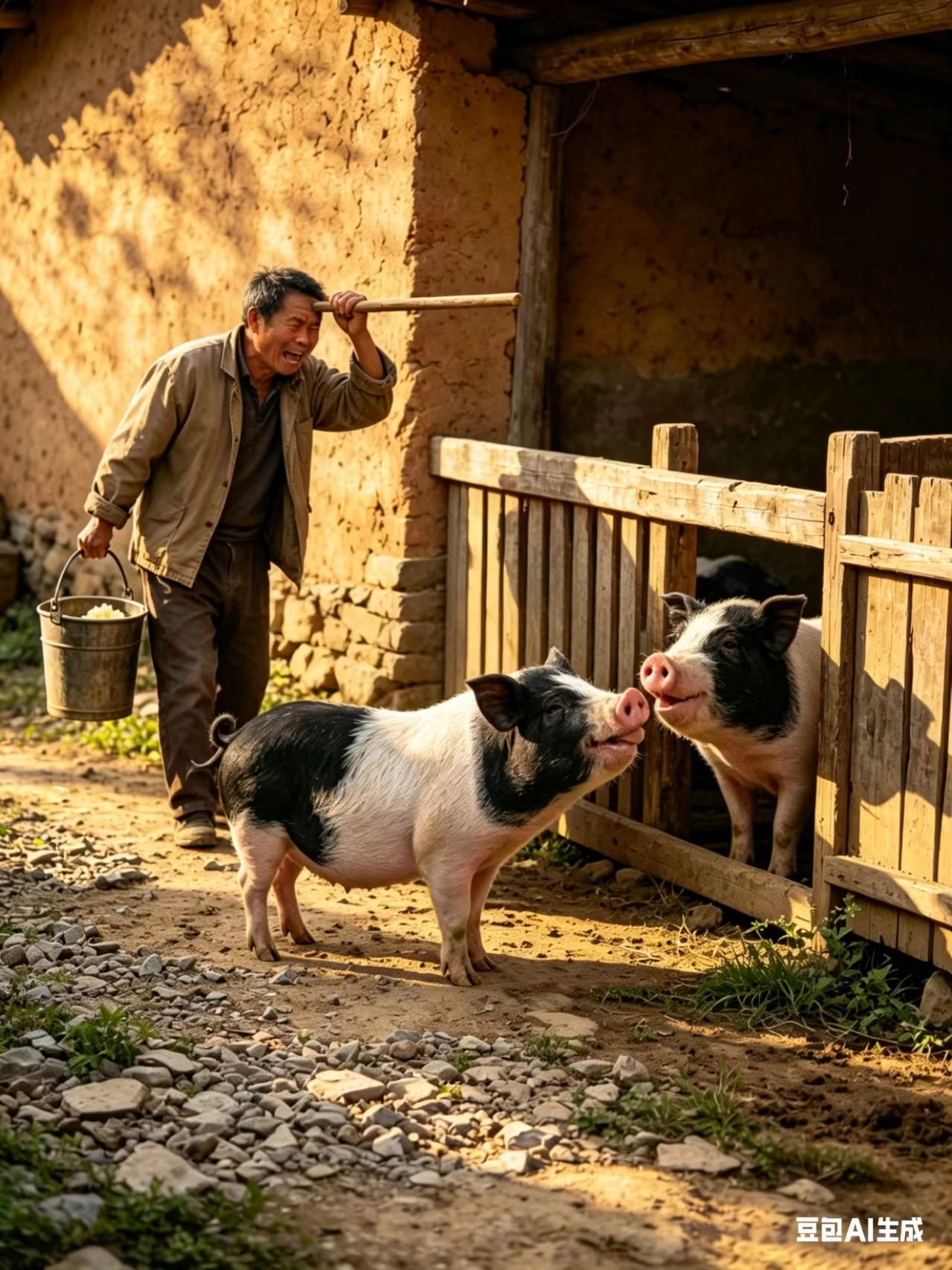 (两个)圈里的猪尖声嚎叫着,奶奶一连催了几次,要我去喂。我提了泔水桶,先打开猪圈门,猪槽里满是泥,我用小铲子把泥铲出去,给大猪添上两舀子食。再来看小猪:这俩小家伙,看我给大猪添食时就没命地嚎,见我来了,就叫得更欢了。我刚把这圈猪槽里的泥弄出去,见那边大猪的嘴伸出了圈门,忙着跑过去准备再给大猪添一舀子猪食。不小心让(被)猪圈门上边一根木棍碰到了额头,气得我“啪”打了它猪嘴一下,闩上圈门,不理它了。