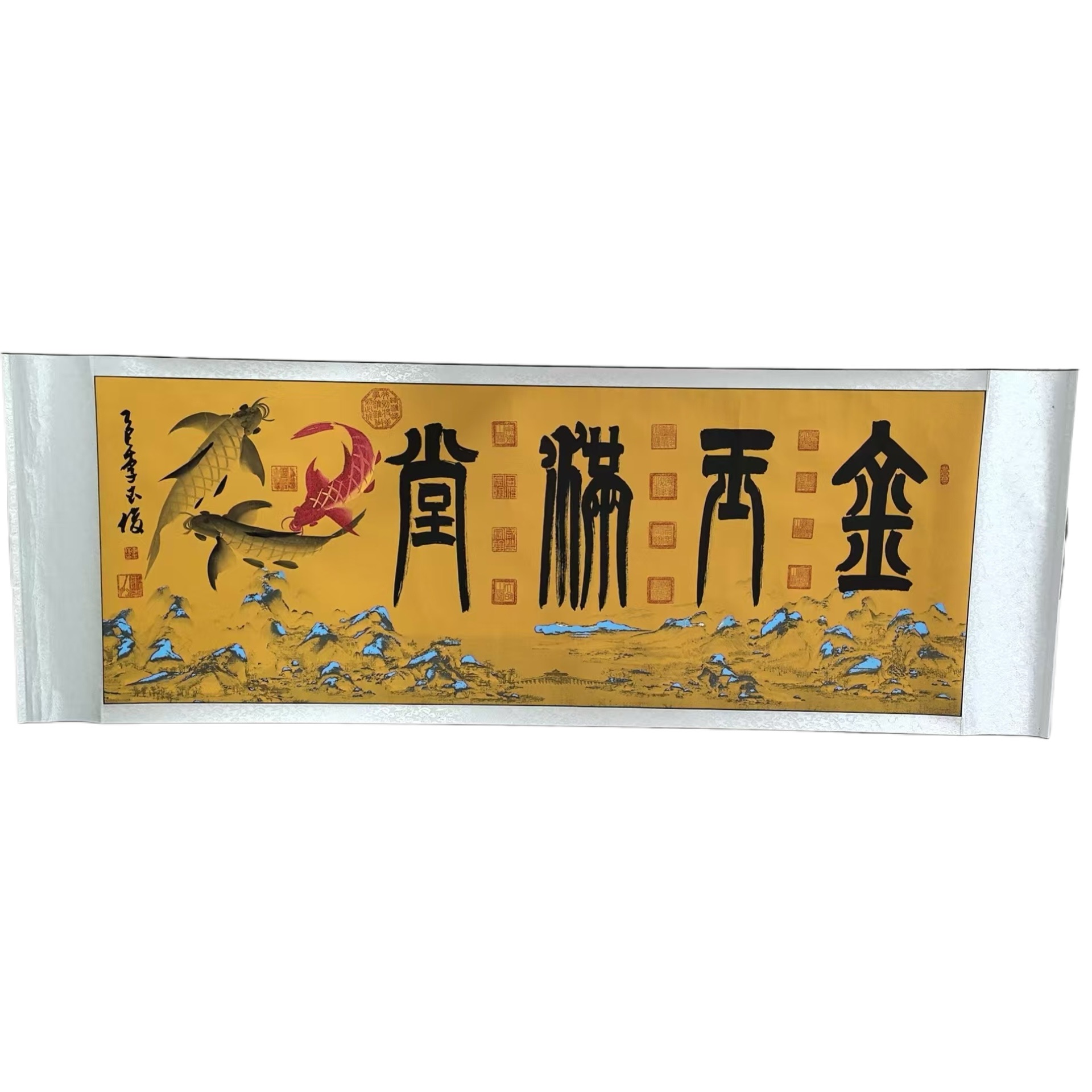 锦鲤在中国文化中有着 “鲤鱼跃龙门” 的典故,象征着步步高升、吉祥如意。它们与 “金玉满堂” 的文字相结合,进一步强化了作品的吉祥寓意,让画面不仅有视觉上的美感,更有文化情感上的共鸣。