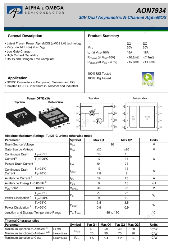 MOS管产品型号都是AON7934,是万国半导体的双N沟道MOS管,封装方式为Power DFN3x3A。