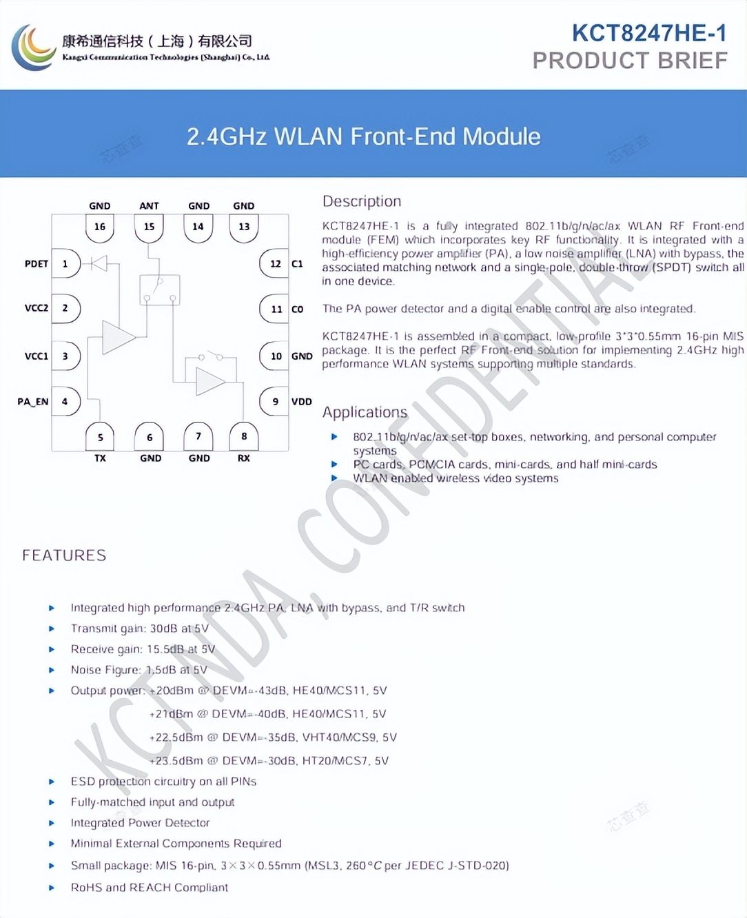 这颗FEM(射频前端模组)芯片来自康希通信,型号为KCT8274HE,封装方式为MIS-16L,在无人机中负责射频前端处理。该产品是一款高集成度、高性能、小尺寸的2.4GHz WLAN射频前端解决方案,集成了功率放大器、低噪声放大器、射频开关等电路,特别适合无人机等对空间和功耗有严格要求的无线设备。其低噪声、高增益、强输出的特性,可提升无线连接的稳定性和覆盖范围。