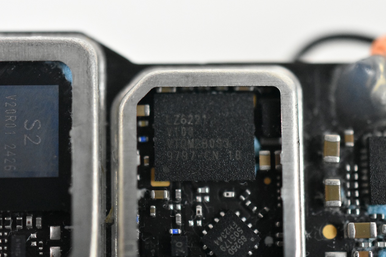 下面这颗略小的芯片丝印为8525D 505A79 FH2344,来自圣邦微的SGM 48525DB系列,封装方式为SOIC-8。该芯片为双通道高速低侧栅极驱动IC,适用于驱动MOSFET和IGBT等功率开关器件,是高速、高可靠性的功率开关接口。其高电流输出、低延迟、强抗干扰能力和宽温工作范围(-40°C至+140°C)使其非常适合无人机等对可靠性、响应速度和功率密度要求高的嵌入式系统。