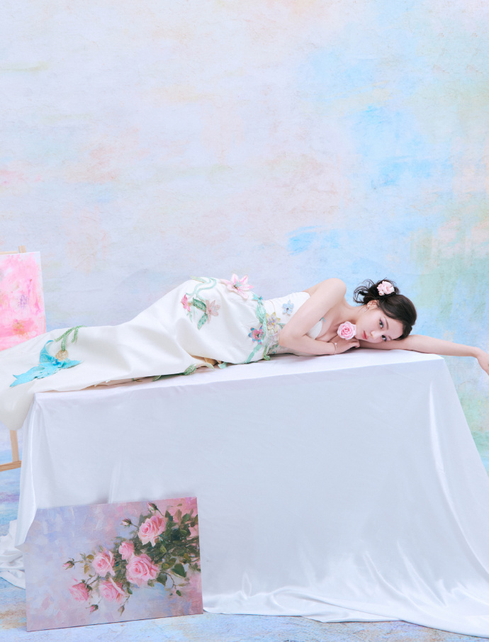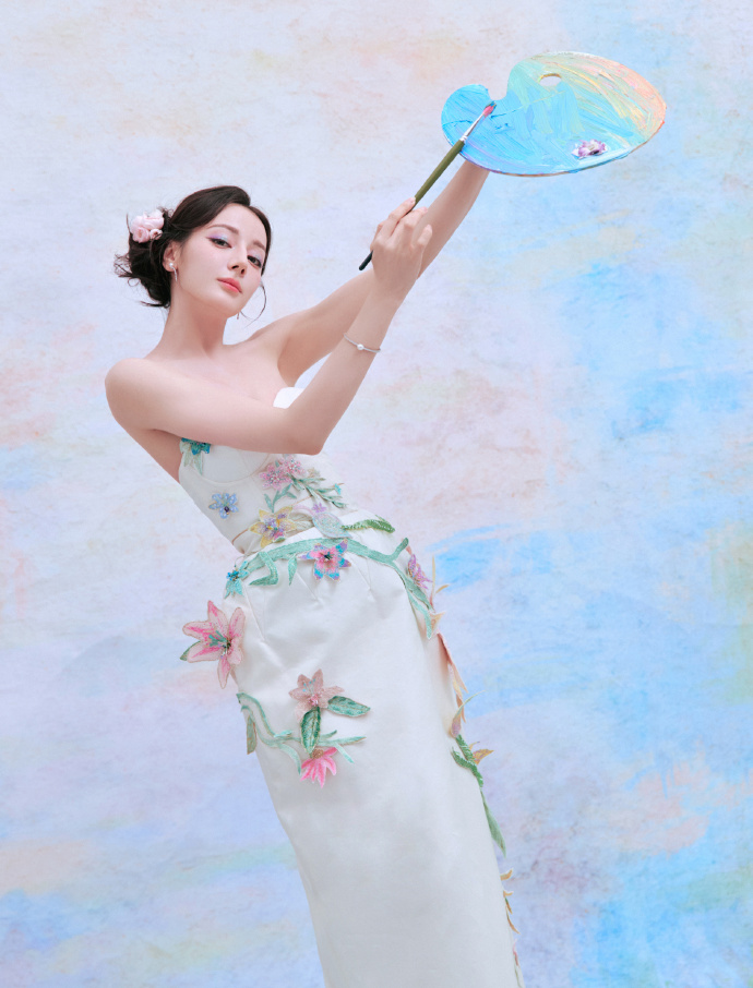 我们可以在最新的一组照片中,迪丽热巴一袭花仙子般的装扮,仿佛从画中走出来的一般。