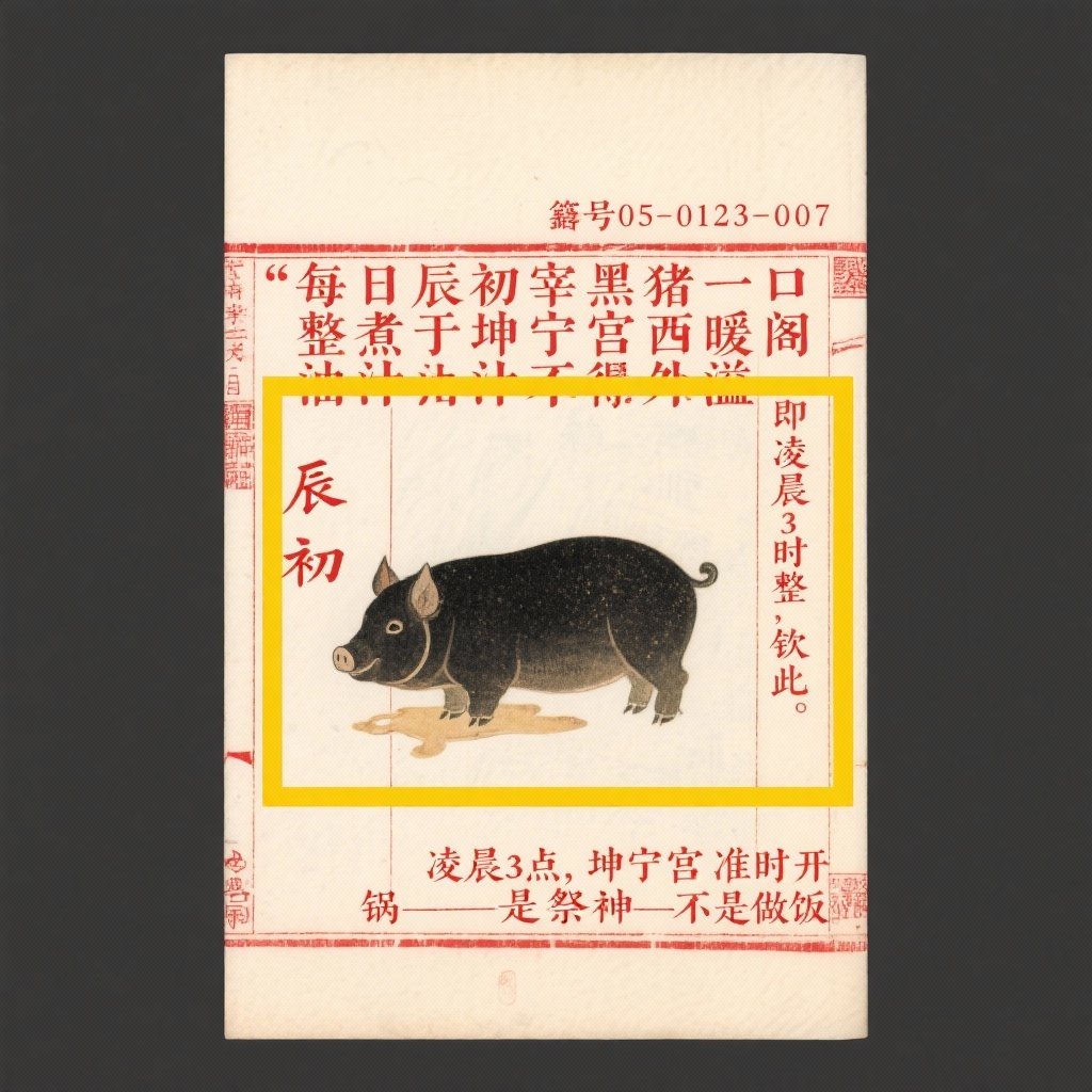 西暖阁改“祭神煮肉房”,架设三口直径1.8米铜锅,专煮祭神猪肉(《大清会典事例》卷四百二十七载:“每日辰时,宰黑猪一口,去毛不去血,整煮于坤宁宫”);