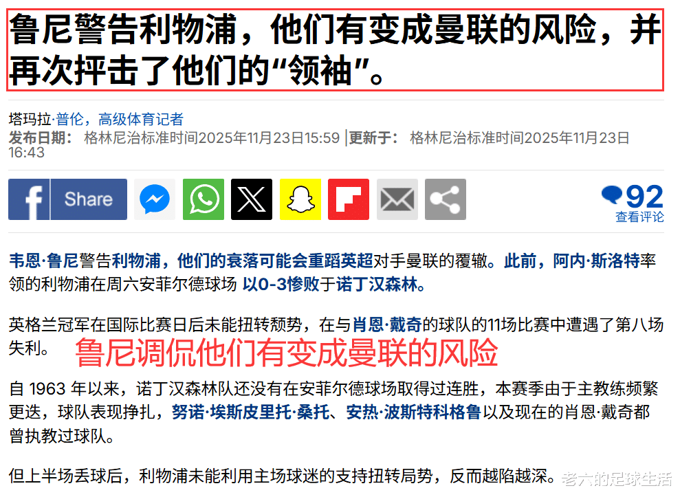 有意思的是曼联传奇球员韦恩·鲁尼在节目里评价利物浦“他们有变成曼联的风险”这是一下嘲讽两支球队了,虽然这是玩笑话,但现在的利物浦需要抓紧时间赶紧改变了。