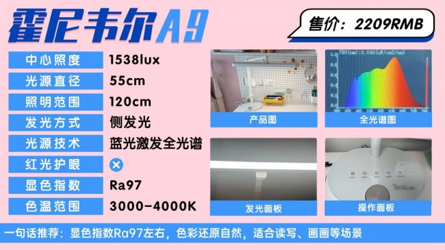 霍尼韦尔A9采用55cm长矩形灯头,搭配侧发光技术,照明范围约1.2米,中心照度1538lux,均匀度优于国AA级标准;搭载全光谱灯珠,显色指数Ra97左右,色彩还原自然,适合读写、画画等场景;功能上支持入座感应、离座延时关灯和自动调光,使用比较省心。但短板明显:整机尺寸大、重量重,移动和调节不便,对书桌空间要求高;核心护眼技术无突破,无红光养护功能,定价处于中高端区间,性价比一般,适合桌面空间充足、预算宽松的家庭。
