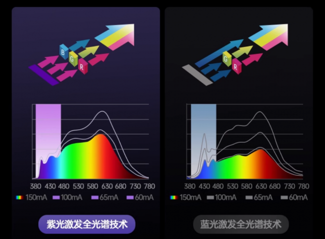 为什么重要:这关系到光谱的完整性。普通LED由蓝光芯片激发,光谱中蓝光峰值高,红光等波段容易缺失。而优质的全光谱技术(如紫光激发),能从光源底层构建更连续、均衡的光谱,无限接近自然光,从根源上减少因光谱残缺导致的用眼疲劳和色彩失真。