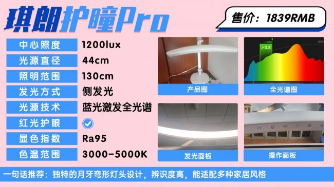琪朗护瞳Pro核心亮点是独特的月牙弯形灯头设计,辨识度高,能适配多种家居风格;操作区域位于灯头前方,支持触控调节亮度与色温,3000K-5000K色温范围能满足基础场景需求;光线经柔光处理后柔和度尚可,能满足日常读写需求。但不足较多:灯体以亚克力材质为主,质感普通;功能设计基础,无智能感应、定时提醒等进阶功能。照明范围有限,大桌面使用时边缘亮度不足,核心护眼配置也无亮点,适合仅看重外观、对护眼要求不高的家庭。