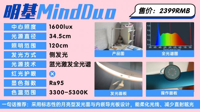 明基MindDuo采用标志性的月亮型发光面与内嵌导光板设计,能柔化光线、减少直射眩光,光线分布较均匀,34.5cm光源面可覆盖单人学习桌面;金属灯臂为四轴联动结构,调节角度灵活,适配不同桌面和坐姿。功能上配备智能感光调光和入座自动开灯/离座延时关灯,日常使用比较便捷。但短板突出:灯头因集成功能模块较多,重量偏大,频繁调节后易出现轻微晃动,长期使用支撑稳定性下降;光谱中蓝光峰较为突出,连续性不如自然光,长时间学习光线偏刺激,结合其较高定价,性价比一般。