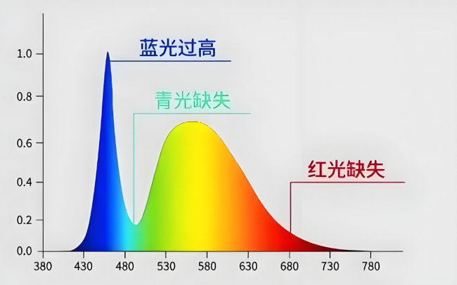2.看光谱图:优秀的光源不是粗暴地砍掉蓝光(那样会导致光线严重偏黄、显色性差),而是通过光谱技术重塑光谱曲线,在保证光线色彩饱满自然的前提下,压低有害蓝光的峰值,使其分布更接近健康的自然光。