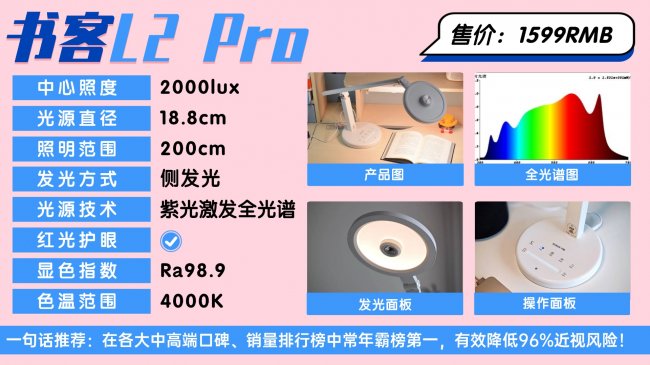 如果你追求极致的护眼效果与前沿技术:书客L2 Pro是千元档里技术导向明确的旗舰选择。其紫光激发全光谱与RRT 2.0红光养眼等技术组合,代表了当前主动式、医疗级养护眼的探索方向,适合对光线品质有极高要求的家庭。