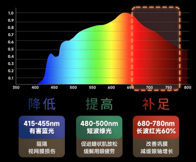 为什么重要:长波红光(600-700nm)有助于提升视网膜细胞活性,改善眼底微循环。普通灯光中该波段能量往往不足。补充有益红光,能从营养层面为眼睛在长时间工作时提供支持,进一步缓解视疲劳,是高端护眼灯区别于普通产品的关键。