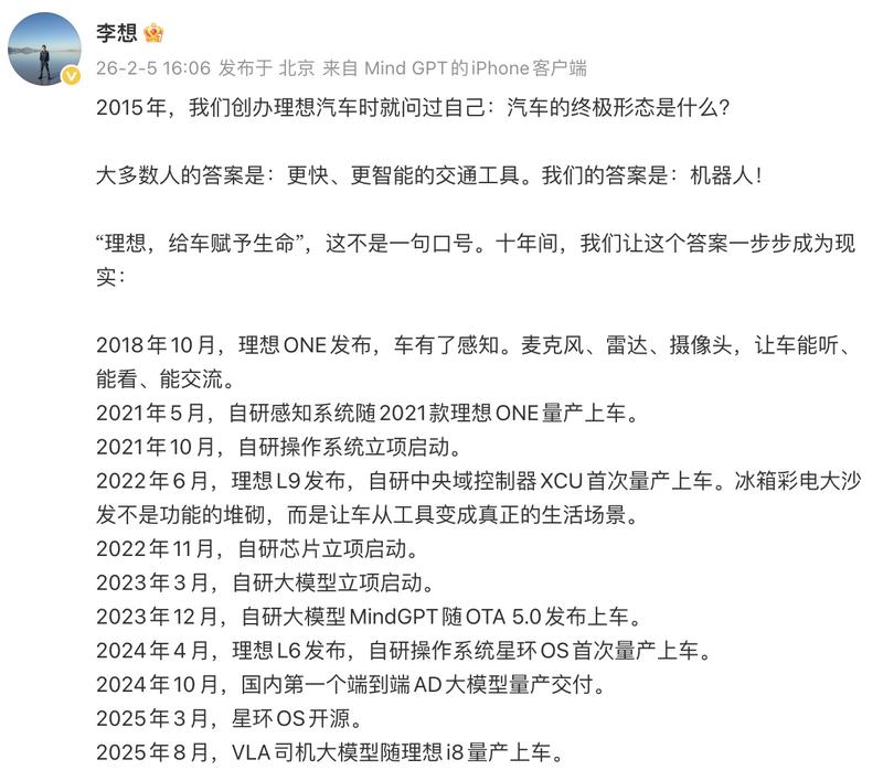 李想表示,2015年,我们创办理想汽车时就问过自己:汽车的终极形态是什么?大多数人的答案是:更快、更智能的交通工具。我们的答案是:机器人!李想还表示,这两年有很多人问我,是不是all in AI就不关注汽车了。恰恰相反,我们深知:具身智能必须长在一台好车上,才能真正为用户创造价值。所以我有70%的时间聚焦在汽车上,这让我们更了解如何让车进化成真正的机器人。
