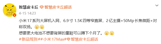 近日,据博主@智慧皮卡丘 透露:小米将于下个月发布一款新机——那就是小米17 Max!这款全新的超大屏旗舰,不仅拥有6.9英寸的巨屏,更是塞进了8500mAh的电池,堪称小米史上最强的“续航怪兽”。