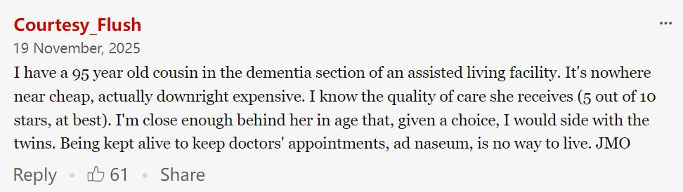 “我有一位95岁的表姐,独自住在一家养老院的重症痴呆病区。说实话,那里的费用可不低,简直算是贵得离谱。她得到的照顾,要我打分的话,最多给5分,满分10分。我跟她年纪差不多,要是能选的话,我也选这对姐妹花的做法。只是日复一日、没完没了地预约看医生来维持生命,过着不算有质量的过日子没意思。当然这仅代表个人看法。”