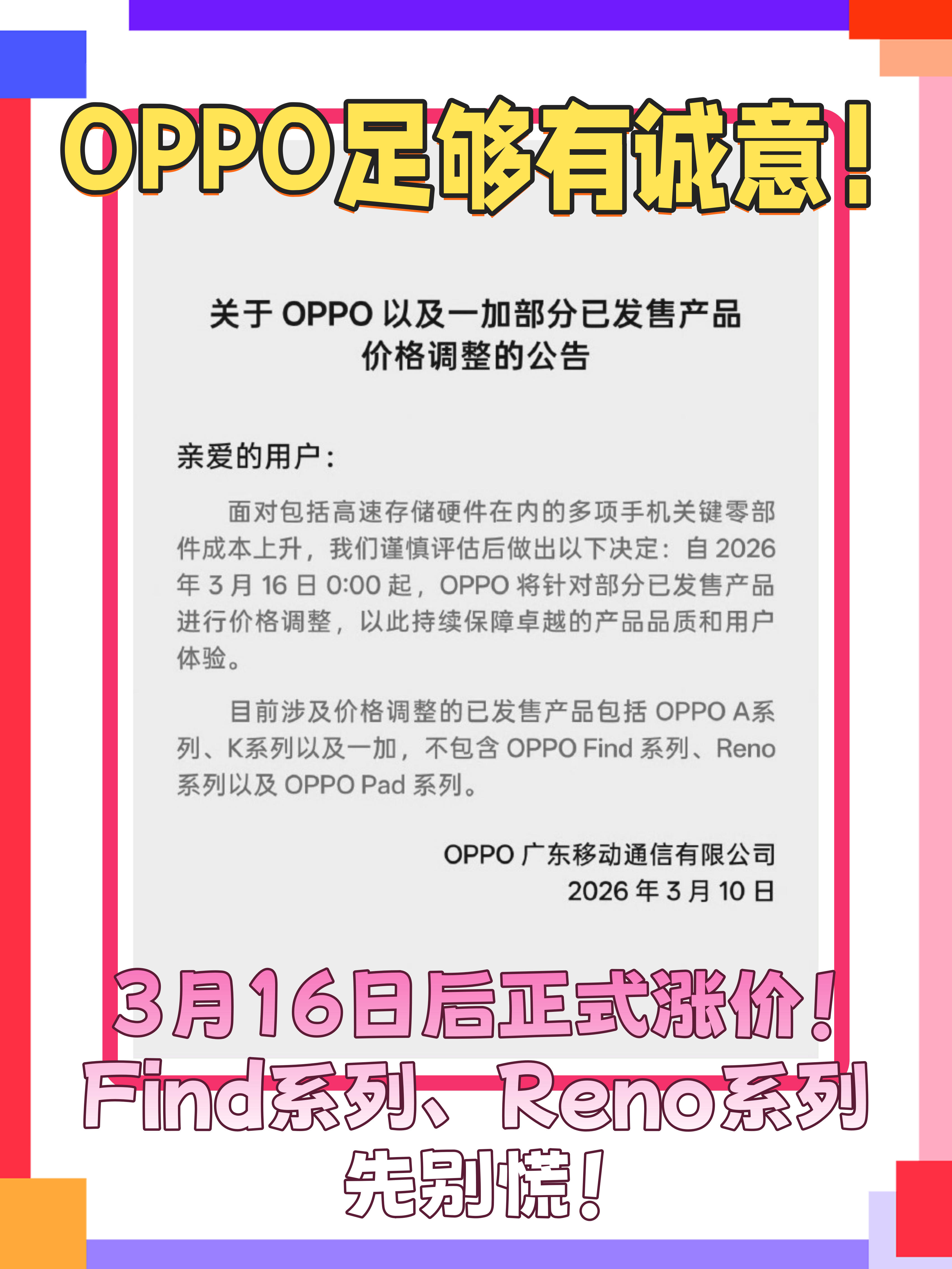 更让人满意的是OPPO还表示了Find系列和Reno系列目前还不会涨价,这下想换中高端机型的朋友们也不用太着急了!说不定能等一等OPPO Find X9 Ultra、OPPO Find N6等机型出来再考虑~