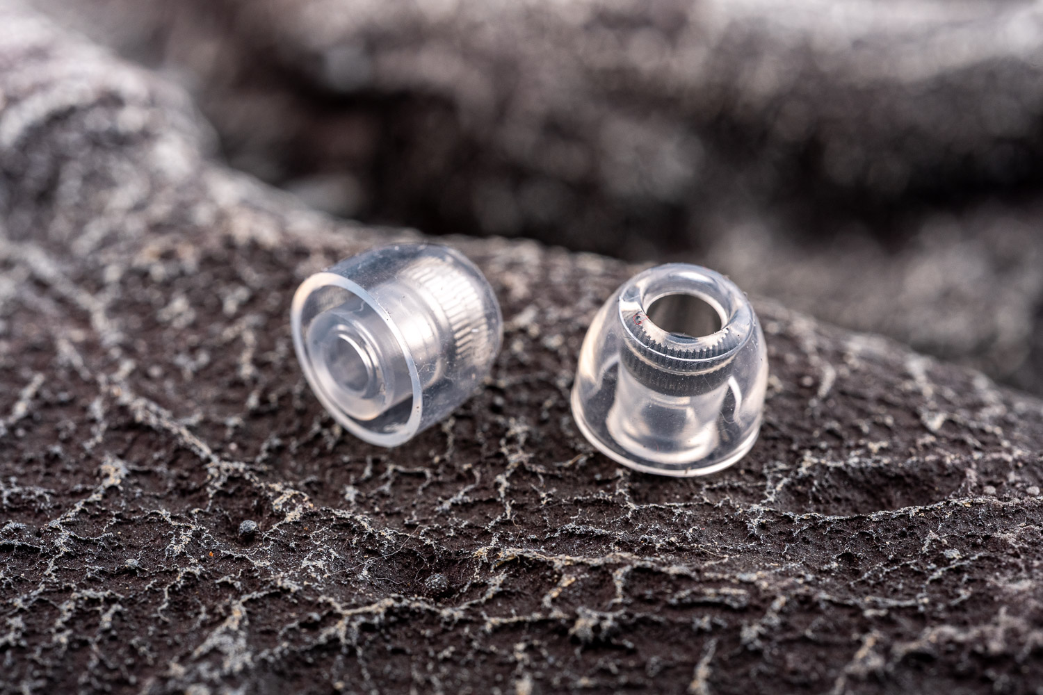 包装盒还是老样子,背面有一个可以直接抠开的设计方便拆开,打开以后里面是一对套子本体,在刚开箱的时候耳塞套整体的透明度非常好,内部的金属导管泛着漂亮的光泽。中间的金属导管部分采用的是外科级的SUS316不锈钢材料,比较耐腐蚀、具备低致敏性,而且与早期的一些金属导管套不一样的是,包括Mithryl在内的一些新款产品在金属导管的部分都会做的更短、位置更靠在出音嘴的地方,可以进一步地在插入耳道以后获得适度的“拐弯”,从而尽可能让出音嘴与耳道更为的平行、更能对着耳洞口的方向,为了加强这一点,Mithryl 的伞帽厚度从根部往顶部方向逐渐变薄,这一点会极大地提升加工难度、降低良品率,可能也是它成本更高的一个核心原因所在。尺寸方面,在选购的时候尽量选择比日常使用小一号的,比如我平时用M号,但Mithryl我用MS可能刚刚好。