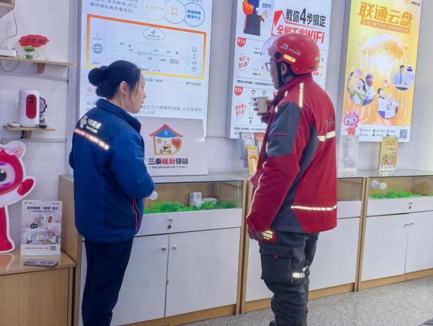 “手机没电了,能充会儿吗?”午后的阳光变得炙热,外卖骑手小杨匆匆停好电车,跑进延安市甘泉营业厅。“可以呀,那边还有椅子可以歇歇。”工作人员笑着指引他到休息区,递上充电设备。中国联通精心打造暖心驿站,饮水、充电、应急药品、休息座椅……驿站虽小,却实实在在地解决了户外劳动者、新就业群体的奔波之需。