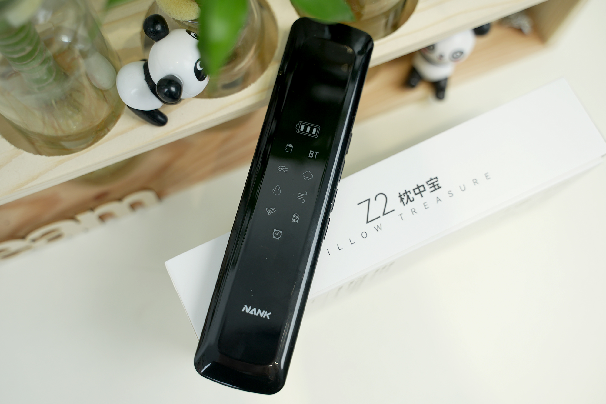 南卡枕中宝 Z2 的外观简约大气,采用黑色搭配扁平式设计,整体的流线型给人一种优雅精致之感,四角边缘经过圆润处理,拿在手里就如同握着电视机遥控器一样,手感舒适。它的尺寸十分小巧,长约 15.5cm、宽 3.6cm、厚 1.2cm,放置在枕头底下丝毫不会有突兀感,并且重量仅有 54 克,哪怕是出差或者旅行,都可以轻松地随身携带,随时随地开启属于自己的私人枕下音乐会。